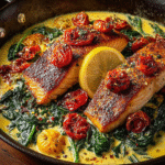 Salmon is often celebrated for its rich flavor and health benefits, making it a favorite among home cooks. This dish, Creamy Tuscan Marry Salmon, elevates the fish with a sumptuous sauce that captures the essence of Italian cuisine. It seamlessly combines creamy, garlicky elements with vibrant greens and sun-dried tomatoes, creating a culinary experience that feels both comforting and indulgent.